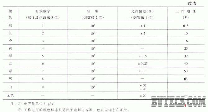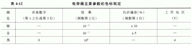 色標(biāo)法就是用不同顏色的色帶或色點,按規(guī)定的方法在電容器表面上標(biāo)志出其主要參數(shù)的標(biāo)志方法。電容器的標(biāo)稱值、允許偏差及工作電壓均可采用顏色進(jìn)行標(biāo)志,其規(guī)定見表4-12 。