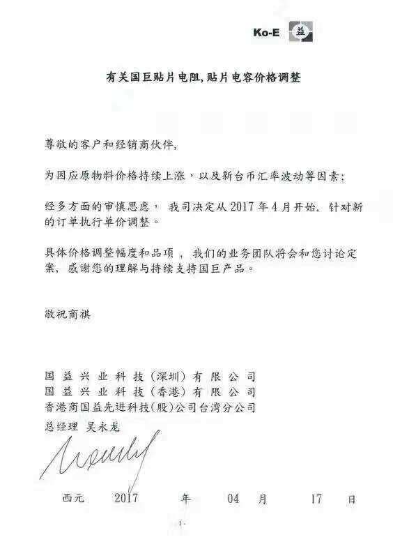 為因應(yīng)原物料價(jià)格持續(xù)上漲,以及新臺(tái)幣匯率波動(dòng)等因素;經(jīng)多方面的審慎思慮,國巨公司決定從2017年4月開始,針對新的訂單執(zhí)行單價(jià)調(diào)整。具體價(jià)格調(diào)整幅度和品項(xiàng),國巨公司的業(yè)務(wù)團(tuán)隊(duì)將和客戶群體討論定案,感謝您的理解與持續(xù)支持國巨產(chǎn)品。