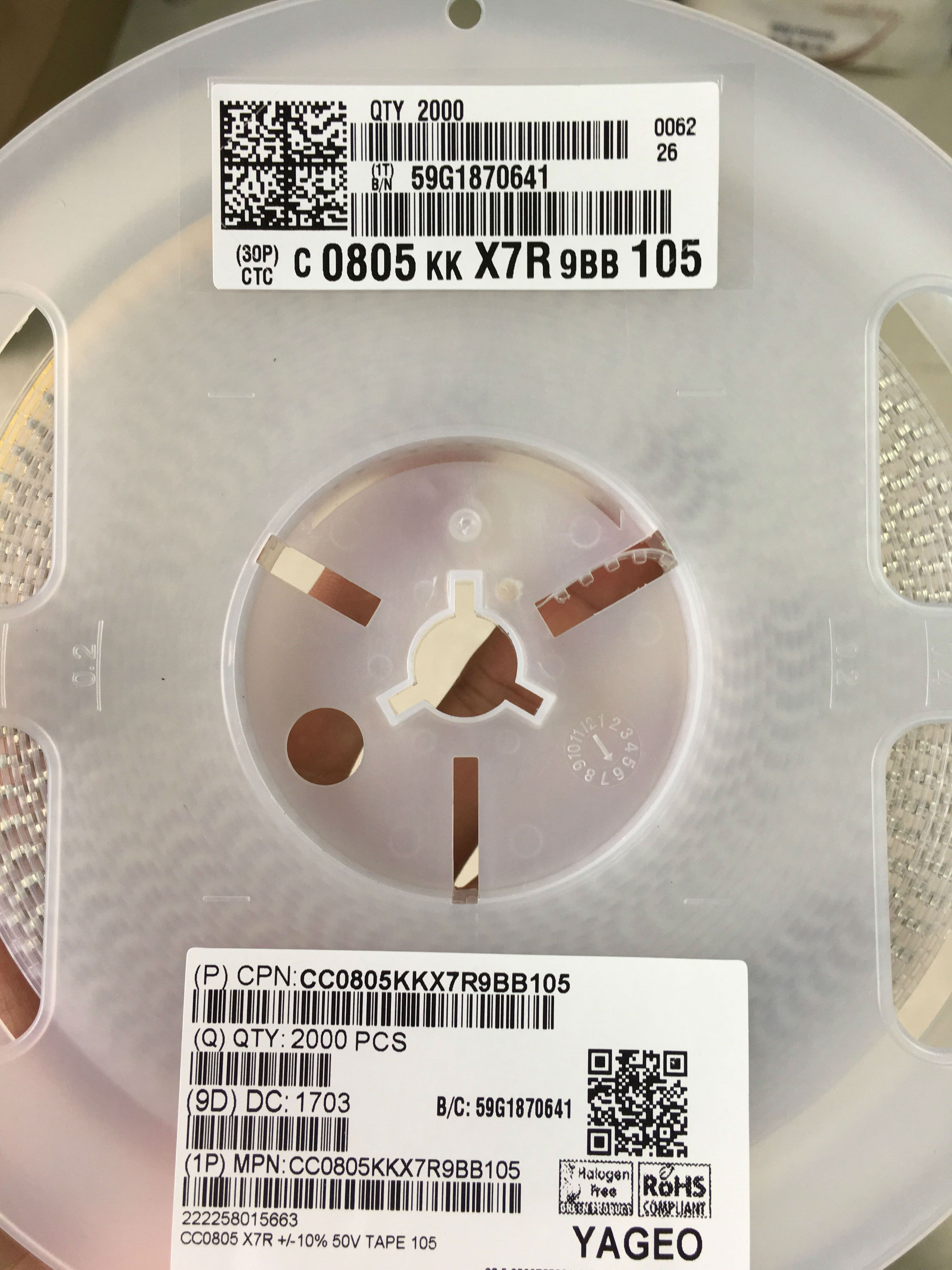 國巨貼片電容0805 106/10uf 6.3V 10%/K X5R;其中參數0805表示貼片電容的尺寸大小,參數106/10uf表示該貼片電容的容值是106/10uf,參數6.3V表示該貼片電容的耐壓值為6.3V,參數10%/K表示該貼片電容的誤差為上下幅度為10%,參數X5R表示該貼片電容的材質是X5R;其中這種規(guī)格的國巨貼片電容也可以表示成:CC0805KRX5R5BB106