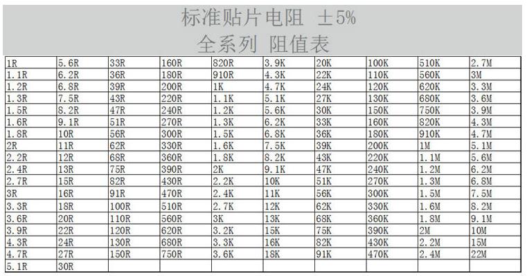 二.厚聲貼片電阻阻值列表如下: